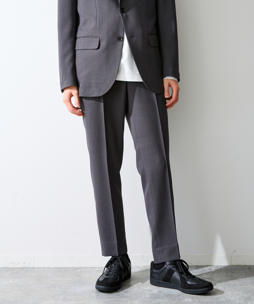 ■デザイン 細かいバーズアイ柄が上品さを際立たせる、クリーンな印象のテーパードスラックス。 腰まわりは程よくゆとりを残しつつ、裾に向かってすっきり細くなるシルエットで、スタイルを美しく見せる設計になっています。 センタープレスが縦のラインを強調し、脚全体の印象がシャープに整うのもポイント。 フロントの前立てやベルトループなど、トラウザーらしい端正なディテールを備えており、 オンオフ問わず使える上品さと扱いやすさを両立した万能パンツです。 ■素材 ポリエステル100%のバーズアイ生地を使用し、軽さ・丈夫さ・扱いやすさを兼ね備えた素材感。 シワになりにくく、長時間の着用や移動にも強いため、デイリーからビジネスシーンまで安心して使えます。 さらりとしたドライタッチで肌離れが良く、季節を問わず快適。 生地自体にわずかな表情があるため、無地のスラックスよりも上品で奥行きのある見た目に仕上がっています。 ■コーディネート シャツを合わせればクリーンで洗練された印象に、ニットやカットソーと合わせると程よくカジュアルダウンした大人スタイルに仕上がります。 同生地のジャケットと組み合わせればセットアップとして着用いただけ、ビジネスカジュアルにも自然に対応。 スニーカーと合わせても上品さが崩れず、革靴と合わせればより端正な雰囲気に。 グレーやグレーは柔らかく落ち着いた印象、ネイビーはより引き締まりスマートな印象と、カラーによって雰囲気の違いも楽しめる一本です。 ■同シリーズ 品番:26010722801010 品名:PE BIRDSEYE 2B JK 品番:26030722801010 品名:PE BIRDSEYE SLACKS 《画像についてのご注意》 ※照明の関係により、実際よりも色味が違って見える場合があります。 またパソコン・スマートフォンなどの環境により、若干製品と画像のカラーが異なる場合もございます。 ※商品の色味は、商品アップ画像をご参照ください。 【商品のお気に入り登録について】 「カートに入れる」右側のハートマークを押していただくと、 残り1点、セールなどの通知を受け取ることが出来ます。 【再入荷お知らせについて】 「カートに入れる」から「再入荷お知らせ」を押していただくと 完売した商品が再入荷した際に、通知を受け取ることが出来ます。 本体:ドライクリーニング