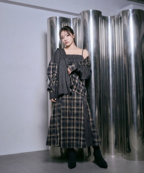 2種類のチェック生地を使ったクラシカルなキャミワンピース。切替と柄使いで立体感を出しつつ、すっきりとしたシルエットに仕上げました。 同じ生地のフーディーシャツと合わせるのもおすすめです。