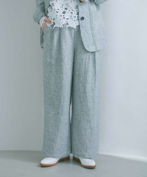 毎年好評のリネン100%シリーズが今年も登場! スタイリングに取り入れやすいストレートパンツ ーーー 【素材】 肌馴染みの良い柔らかな風合いが特徴のリネンを使用。 無地見えのハケメチェックで綺麗めに仕上げています。 【デザイン】 体の線を拾わない程よい太さのストレートシルエットのリネンパンツ。 ベルトフロント部分はフラット仕様で、ゆとりがありながらもお腹周りをすっきりと見せてくれます。 アイテム問わず合わせやすいストレートシルエットは、カジュアルから綺麗めまで幅広く着こなせる一着です。 ボトム パンツ リネン セットアップ ーーー 【スタイリング】 ブラウス合わせで綺麗めに、カットソー合わせでカジュアルに。 同素材の『品番:594166 シングルリネンジャケット』と合わせたセットアップでの着こなしもおすすめです。