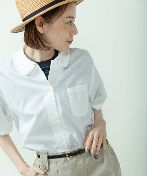 ●●● WEB LIMITED COLOR / WHITE ●●● スタイリングにちょっぴり甘さをプラスする襟フリルブラウス。 細番手のコットン糸で織り上げた滑らかなブロード生地は、ベーシックながらもどこか洗練された上品さが特徴です。 カッチリとしたシャツディティールに所々丸みを持たせ、ややゆとりのあるシルエットにしたことで、レトロな雰囲気もありつつトレンド問わず着ていただけます。襟端に施したフリルとヨーク切り替えのギャザーで着映えするデザイン。 落ち着いた色味のブルーとグリーンは、大きすぎない絶妙なサイズのギンガムチェック柄をチョイス。着こなしの主役にぴったりのパープルは、程よくかわいらしい印象の細かい柄で挑戦しやすい差し色に。さっぱりとした甘さで、スタイリングに取り入れやすいホワイトはWEB限定カラーです。女性らしいフリルブラウスは、デニムやカーゴパンツなどのメンズライクなボトムと相性抜群。ワークなオーバーオールと合わせてバランスを楽しむ着こなしもおすすめです。 ※パープル、ブルーは後日販売開始致します。 -------------------- 透け感:なし 裏地:なし 伸縮性:なし 光沢感:なし ポケット:あり -------------------- 【素材の特性・お取り扱いの注意】 ・取り扱いの注意については取り扱い表示をよくご確認の上、着用をお願い致します。 ・(ブルー、グリーン)汗や雨等で濡れた場合、摩擦などにより色落ちし、他の衣料に移染することがありますのでご注意下さい。 ※撮影画像は、光の当たり具合やモニターの環境により色味が違って見える場合があります。あらかじめご了承下さい。 ※ホワイト、グリーンの画像はサンプルを着用しています。お届けする実際の商品と仕様、加工、サイズが若干異なる場合があります。 グリーンのサンプルの画像から一番下のボタンが4cm上に付き、ボタン間隔が均等になります。