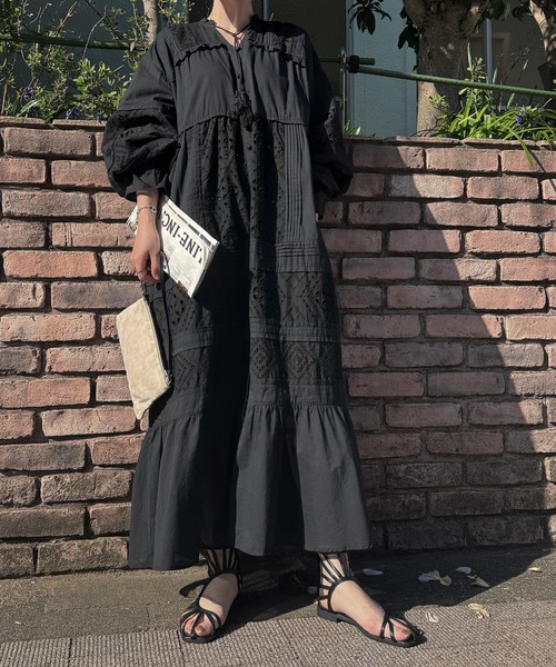 【デザインポイント】 ・コットンローンとレース生地を配置したボリュームワンピース ・所々にピンタックのテクニックも ・前開きになっており、羽織として着用することも 【スタイリングポイント】 ・デニムやパンツをレイヤードしたスタイリングも ・カラーもののキャミソールやタンクを合わせてアクセントに ・袖口はゴム仕様で袖上げの調整も可能に ※サンプルの為、仕様が異なります。 <サンプルからの変更点> ・袖丈は変わらず、カフス丈が2cm長くなります。 透け感 あり 伸縮性 なし 裏地 なし ウエストゴム なし ファスナー なし ポケット なし アジャスター なし 繊細な素材の為、強度な力が加わると縫い目が開いたり滑脱の原因になる可能性がございますのでご注意ください。 素材の性質上、引っ掛け、引っ掛かりが起きやすいので、お取り扱いにご注意ください。 この製品は、素材の特性により多少の染めムラやネップ、 織キズのようなものが見られる可能性がございますがご理解の上ご購入ください。 丈詰め等のお直しにつきましては、弊社でご対応出来かねます。 お直し内容の可否につきましては、お近くのお直し専門店でご相談、ご依頼いただけますようお願い致します。 なお、お直し後の返品交換は出来かねますので、ご了承ください。 ・家庭用洗濯禁止 ・クリーニング ・タンブラー乾燥禁止 ピースド コットン レース ティアード ボリューム ワンピース