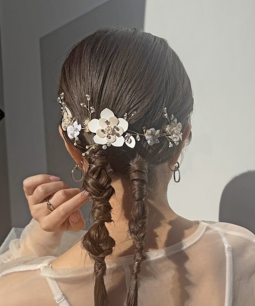 特別な日を彩る、繊細で華やかなフラワーヘッドアクセサリー。立体感のあるフラワーモチーフに、パールやクリアビーズを贅沢に散りばめ、上品な輝きをプラスしました。マットな質感のお花と、きらりと光るパーツのコンビネーションが、ヘアスタイルを一気に高見えさせてくれます。ワイヤー仕様になっているため、アップスタイルに沿わせたり、編みおろしに絡ませたりとアレンジも自由自在。お団子やシニヨンの根元に巻き付けるだけで、後ろ姿まで抜かりなく可愛いスタイリングが完成します。結婚式や二次会、パーティーや発表会など、特別なオケージョンシーンにぴったり。優しい色合いなので、どんなカラーのドレスとも相性抜群です。つけるだけでヘアアレンジを格上げしてくれる主役級アクセサリーです。