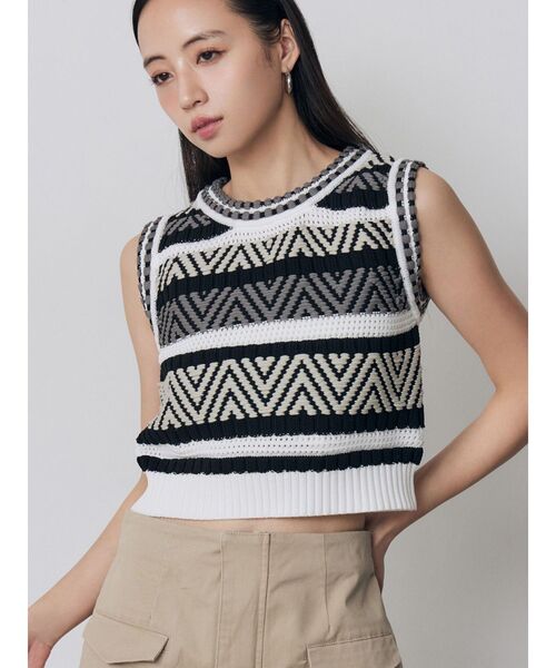 コーデの主役!柄ニットタンク 編地で演出した程よい抜け感もポイント◎ ■アイテム 立体感のある糸を使用した、存在感のあるニットタンク。 コンセプトらしいトライバル柄をベースに、柄の間にクロシェ編みを入れることでメリハリのある表情に仕上げました。 配色にもこだわり、1枚でコーデの主役になるデザインです。 ボディに程よくフィットするシルエットで、インでもアウトでもバランス良く着用できます。 凹凸感のある編地が特徴のニット素材を使用し、軽さと着心地の良さもポイントです。 デニムやフレアパンツ合わせでカジュアルに、ジャケットインでモードにまとめるのもおすすめです。 --------------------------------------------- 透け感:あり 生地の厚さ:普通 裏地:無し 伸縮性:あり -------------------------------------------- 【知って得する便利機能◎ 】 ■商品のお気に入り登録 再入荷時、ラスト1点の時、セール開始時にお知らせします。 ■ブランドのお気に入り登録 新商品やセール情報など、いち早くお得な情報をゲット! ぜひご活用ください! ※着用画像はフラッシュの加減で実際の製品と色味等が異なる場合がございますので、生地のズームアップ画像をご確認ください。 ※ご利用の端末画面の設定により実際の商品と色味が異なる場合がございます。