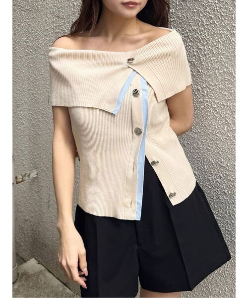 シャツのレイヤード見えデザインのオフショルダーニット 大きめのシルバーボタンがコーデを華やかに◎ ■アイテム 大きめの折り返しデザインで、デコルテがきれいに見えるオフショルダーニット。 シャツ生地のレイヤードで他にはないデザインに。 また、シルバーボタンがポイントで、目を引くデザインに仕上げました。 下のボタンを開けてアウトスタイルで旬な着方がオススメですが、ボタンを開けずインスタイルでの着用も◎ --------------------------------------------- 透け感:無し 生地の厚さ:普通 裏地:無し 伸縮性:あり -------------------------------------------- 【知って得する便利機能◎ 】 ■商品のお気に入り登録 再入荷時、ラスト1点の時、セール開始時にお知らせします。 ■ブランドのお気に入り登録 新商品やセール情報など、いち早くお得な情報をゲット! ぜひご活用ください! ※着用画像はフラッシュの加減で実際の製品と色味等が異なる場合がございますので、生地のズームアップ画像をご確認ください。 ※ご利用の端末画面の設定により実際の商品と色味が異なる場合がございます。