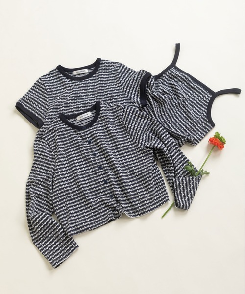 夏らしいボーダーに小さなドットを組み合わせたレトロなカーディガン。 生地屋さんの古い資料を基に作成したオリジナルテキスタイルです。 模様を織り込んで表現しているジャガードの為、プリントとはひと味違った表面感のある生地が特徴。 編んだ後には染めの工程があり、手間と時間のかかったこだわりの生地です。 吸湿性に優れた綿の糸と速乾性のあるポリエステルの糸を使用し、さらりとした着心地がこれからの暑い夏場にも活躍。 ポリウレタン混で伸縮性も高い為、キックバック(生地を伸ばした後に戻る力)が良く、型崩れしにくいのも嬉しいポイントです。 生地を活かしてシンプルながらもブランドらしく、スッキリとコンパクトなサイズ感に。 前を閉めて一枚で着た時にも着映えするデザインです。 軽くてシワになりにくく、持ち運びしやすい為、夏の冷房や日焼け対策にも重宝します。 同シリーズの半袖Tシャツ(0101CT017261)やキャミソール(0101CT018261)と合わせてアンサンブル風に着て頂くのもオススメです◎ ----------------------- 透け感:なし 裏地:なし 伸縮性:あり 光沢感:なし -------------------- ※レッドは後日、販売いたします。 【素材の特性・お取り扱いの注意】 ・取り扱いの注意については取り扱い表示をよくご確認の上、着用をお願い致します。 ・この製品は汗や雨等でぬれた場合、摩擦などにより色落ちし、他の衣料に移染することがありますので取扱いに御注意下さい。 ※撮影画像は、光の当たり具合やモニターの環境により色味が違って見える場合があります。あらかじめご了承ください。 ※着用の商品はサンプルで撮影しております。お届けする実際の商品と仕様、加工、サイズが若干異なる場合がございます。