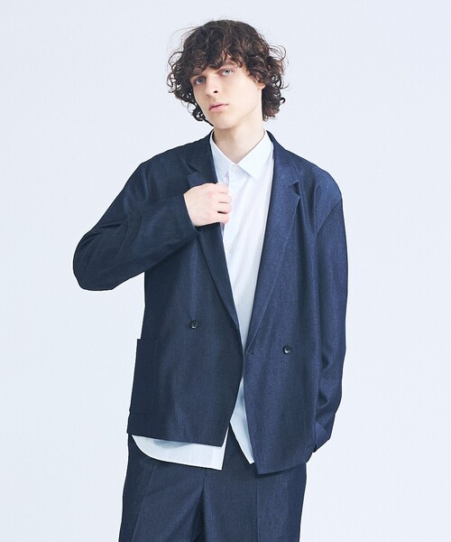 デニム見え、なのに品よく 軽やかで清潔感のある表情。 着合わせで広がるセットアップ展開。 きれい目スタイルを格上げする、上品なシリーズです。 【素材】 色落ちや色移りの心配が少ない、デニムライクのツイル素材を採用。 軽やかな生地感に加え、綾織りならではの美しい表情と程よいハリ・ドレープ感を併せ持ちます。 動きに合わせて表情が生まれ、装いに自然な奥行きと品を添える一本です。。 【デザイン】 程よくゆとりを持たせたシルエットのダブルジャケット。 ダブル特有の存在感はそのままに、ミニマルな設計で軽やかに仕上げています。 フロントはボタン数を絞ることで、重くなりがちな印象を抑え、すっきりとした見え方に。 パッチポケットやボタンレスの袖口など、ディテールも簡潔にまとめています。 肩まわりと身幅にゆとりを持たせながらも、ラフになりすぎないバランスに設計。 羽織るだけで、スタイリングに奥行きと雰囲気をもたらしてくれる一着です。 【コーディネート】 同素材のパンツと合わせたセットアップスタイルはもちろん、単品でも幅広く着回せる一本。 カットソーの上に軽く羽織るだけで、程よく力の抜けた大人のバランスに。 シャツやスラックスと合わせれば、ビジネスシーンにも対応できるきれいめなスタイルに仕上がります。 オンオフ問わず活躍してくれるアイテムです。 【同素材アイテム】 ワイドパンツ(品番:00522159000) テーパードパンツ(品番:00520059005) シングルジャケット(品番:00522180000)