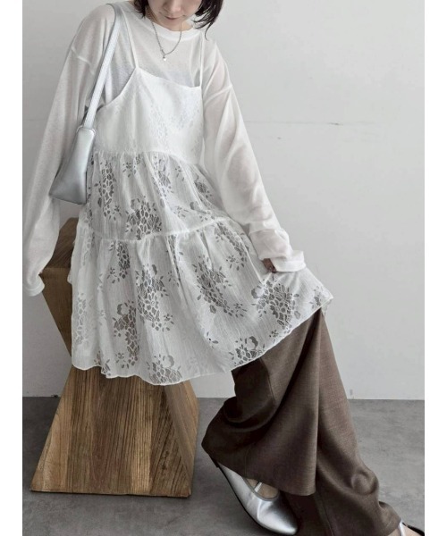 繊細なフラワーレースがやわらかなムードを演出するキャミチュニック。 程よく透け感のある生地で、軽やかなスタイリングを楽しめます。 裾に向かってふんわりと広がるシルエットがポイント。 お手持ちのカットソーとレイヤードしたコーディネートがおすすめです。 【その他採寸】 F 全長:[肩ストラップ]39cm