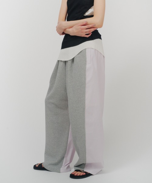 異素材のコンビネーションが光る、THINGS THAT MATTERのシグネチャーなイージーパンツに、春らしい新色が登場。 前身頃には、膨らみ感と柔らかさにこだわった30/10番の国産定番裏毛を。 後ろ身頃はパリッとした清涼感のある肌触りのシャツ地を採用し、異なる質感で遊び心溢れるデザインに仕上げました。 スウェットパンツのようなリラクシーな履き心地はそのままに、素材の持つ品格が加わったことで、シャツやジャケットと合わせた大人のドレスダウンがより洗練された仕上がりに。 日常のスタイルに心地よい緊張感とモードな遊び心を与えてくれる、進化系ボトムスです。 【商品詳細】 ウエストはゴム使用になっており、ストレスフリーに履いていただけます。 まるでスウェットパンツのような履き心地にもかかわらず、1枚でこなれた印象に。 ヒップ回りを大きめに設定している為、ヒップ回りが気にならないシルエットになっています。 ・サックスブルー 前身頃:ブラウンカラー 後ろ見頃:サックスブルーストライプ ・ピンク 前身頃:グレーカラー 後ろ見頃:ピンクストライプ 伸縮性:ジャージ部分(全面)あり 0586TM1590P 出荷予定日がなる商品を、同じカートでご注文いただいた場合、一番遅い納期の商品に合わせてまとめて発送となります。 ※画像の商品はサンプルです。 実際の商品と仕様、色味が若干異なる場合があります。 また 、パソコンやスマートフォンのモニター環境などにより、色味が違って見える場合がございます。 予めご了承ください。 ※店頭及び屋外での撮影画像は、光の当たり具合で色味が違って見える場合があります。 THINGS THAT MATTER (シングス ザット マター) まったく新しいアプローチで、コレクションを展開、感じることの大切さを伝えるブランド。 クリエイティブディレクターにはデザイナー武笠綾子を起用。自分の内側に目を向け、自分を愛するきっかけになってほしい。 自分を愛することで一人ひとりの魂が満たされ、エネルギーが整い、正しく循環することでこの星のすべてを愛することに繋がる。 【 気になるアイテムはお気に入り登録をお勧めします!】 ♡マークをクリックし、再入荷やラスト1点の通知、セールなどのお知らせを受けることができ、お買い物が楽しめます。 ブランドのお気に入り登録もぜひお願いします!
