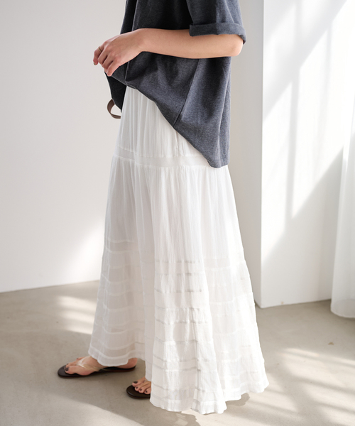 ≪二宮こずえさん×FRAMeWORKの動画でご紹介アイテム!≫ ◆大人気!甘すぎないコットンスカートが再入荷! ・旧品番26060220302020の追加品番です。 ・同一商品でも個体差が生じるため、採寸内容に若干の差が生じる場合がございます。 柔らかなインドコットンクレープとメッシュを切り替えて仕立てたスカート。 表面に凹凸を作ることでさらっと肌離れがよく、涼しく軽い着心地。 動くたびに表情が出る異素材コンビが、シンプルながらも奥行きのある印象をつくります。 裾に向かって緩やかに広がるフレアシルエットで、風をはらむような軽さが魅力。 春夏のスタイリングに自然と馴染みつつ、スタイリングの主役にもなる一枚です。 ********************** 透け感:あり 裏地:あり 伸縮性:なし 光沢感:なし 生地の厚さ:普通 ********************** ※インド製品の特性上、多少の色違い、色ムラ、スラブなどがあります。 ※取り扱いについては、商品についている品質表示でご確認ください。 ※こちらの商品は、FRAMeWORK での取り扱いになります。 直接店舗へお問い合わせの際は FRAMeWORK 店舗へお願い致します。 ※照明の関係により、実際よりも色味が違って見える場合があります。 またパソコン・スマートフォンなどの環境により、若干製品と画像のカラーが異なる場合もございます。 予めご了承の上ご注文ください。 ※商品の色味は、商品アップ画像をご参照ください。 本体:手洗い可能