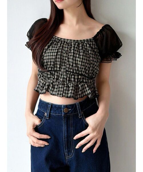 チュールをドッキングしたボリューム感あるデザインブラウス ▽デザイン▽ オフショルでも着用できる2WAY仕様。 袖はシアー素材にしたことで肌の透け感が可愛く、涼し気に♪ バスト下に切り替えを入れ、裾はフリルデザインにしたことで 女性らしさや可愛らしさもプラスします。 コンパクトな丈感でスタイルアップ効果も◎ ▽カラー▽ 無地の白・ミントグリーンと、チェック柄の3色展開。 ▽スタイリング▽ クロップド丈なのでハイウエストボトムとの相性抜群! デニム合わせで甘さを抑えたコーデがおすすめ♪