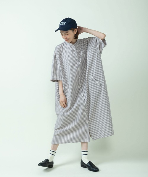 一枚でバサッと華やかに着られるBIGシャツワンピース。 ハリのある生地は空気をはらんで着映えするので、身長、体型問わずどなたが着てもさまになるシルエット。春夏らしい淡いカラーと晩夏まで着やすいチェックの展開です。 オーバーなサイズ感も、ノーカラーの衿と裾のスリットで軽やかな印象に。折り返したような袖は、肌が隠れる面積が多く日差しの強い日も嬉しい。ヨーク切り替えと太めのタックでバックスタイルまでぬかりなく。タックに入ったカンヌキや胸ポケットのペン差しステッチワークなど、さりげないこだわりを詰め込みました。斜めに付いた箱ポケットのディテールもポイント。 暑い夏にさらっと着るだけでスタイリングが完成します。ベストを重ねたり、インナーにTシャツを入れてレイヤードを楽しむのもおすすめ。パンツと重ねてメンズライクに合わせたり、前を開けて羽織ったりと着回し力も抜群のアイテムです。 -------------------- 透け感:なし 裏地:なし 伸縮性:なし 光沢感:なし ポケット:あり -------------------- 【素材の特性・お取り扱いの注意】 ・取り扱いの注意については取り扱い表示をよくご確認の上、着用をお願い致します。 ※撮影画像は、光の当たり具合やモニターの環境により色味が違って見える場合があります。あらかじめご了承下さい。 ※画像はサンプルを着用しています。お届けする実際の商品と仕様、加工、サイズが若干異なる場合があります。 アイボリーとサックスブルーのサンプルの画像から、胸ポケットのボタンホールがなくなります。前立て右端に、左端と同様にコバステッチが入り、サイドポケットの位置が2cm上にずれます。正しいものは他のカラーの着用画像をご覧下さい。