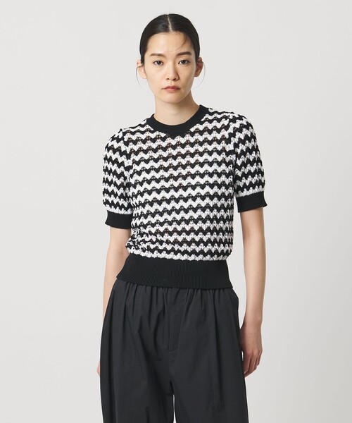 スタイリングの主役に。スポーティ×フェミニンなシェプロンストライプニット ■デザイン ジグザクのボーダー柄と配色デザインが目を引く、ショートスリーブニット。 エッジのトリミングがスポーティーな印象ながら、やや透け感のある編地やコンパクトなサイズ感、袖山に少し入ったギャザーなど、さりげなくフェミニンなディテールを散りばめています。 モノトーンやブルー×ボルドーの配色が、スタイリングの主役にピッタリの一着。 ■素材 丸みのあるコットンコード糸で編み上げたニット。 7Gでややざっくりとしたジグザクボーダーと、透かし柄が涼やかな印象を与えます。 これからの時期に嬉しい、ご自宅でのお洗濯が可能なウォッシャブルアイテム。 ■コーディネート コンパクトなサイズ感は、ボリュームのあるボトムと好相性。 上品な光沢のサテンパンツや、大人カジュアルなデニムやトレンド感のあるバルーンパンツもおすすめです。 ============================ 裏地:なし 透け感:ややあり 光沢感:なし ケア方法:手洗い可 ============================ 【注意事項】 ※商品に「取り扱い上の注意書き」、「洗濯表示」がございます場合は、使用前に必ずご確認ください。 ※商品画像は、光の当たり具合やパソコンなどの閲覧環境により、実際の色味と異なって見える場合がございます。あらかじめご了承ください。 ※商品の色味の目安は、商品単体の画像をご参照ください。 ※画像の商品はサンプルです。実際の商品と色味、仕様、加工、サイズ、素材等が若干異なる場合がございます。 店舗へお問い合わせの際は、全国のUNITED ARROWS各店舗まで下記の品名/品番をお申し付けください。 品名:AM C CHEVRON STRP SSL 品番:87181830003