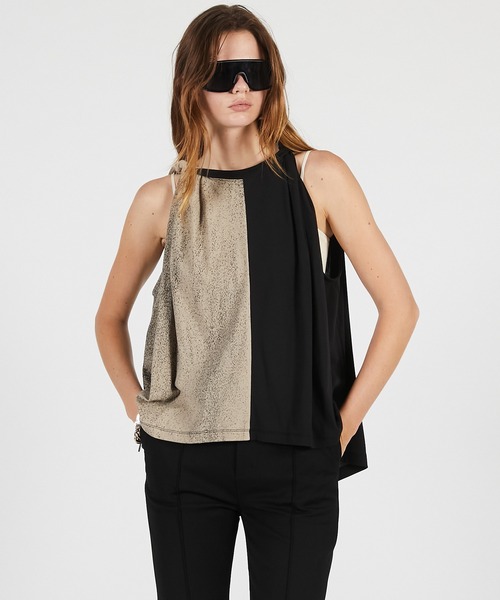 ーStyleー大胆に半分切替えたノースリーブトップ。 掠れプリントの入ったパーツと無地パーツをドッキングし、カラーブロックにすることでモードな印象に。 ツイストさせた肩がさりげないデザインポイント。 前後の着丈に差をつけて、シルエットにコントラストを効かせてくれる。 お尻部分が隠れる着丈で体型カバーも◎ ーFabricー 超強撚糸を使用して編み上げたドライタッチなベアフライスを使用。 肌離れの良さと軽い着心地がストレスフリーな素材。 【PRANKPROJECT/プランクプロジェクト】 常識に縛られない洗練された大人の女性に向けて ”意外性”と”品の良さ”をMIXさせた 上質なNEWMODEBRAND ・商品のお気に入り登録再入荷、残り1点などの通知を受け取ることが出来ます。 ・ブランドのお気に入り登録新商品や再入荷、ショップのおすすめトピックスなど、いち早くブランドのお得な情報を受け取ることができます。