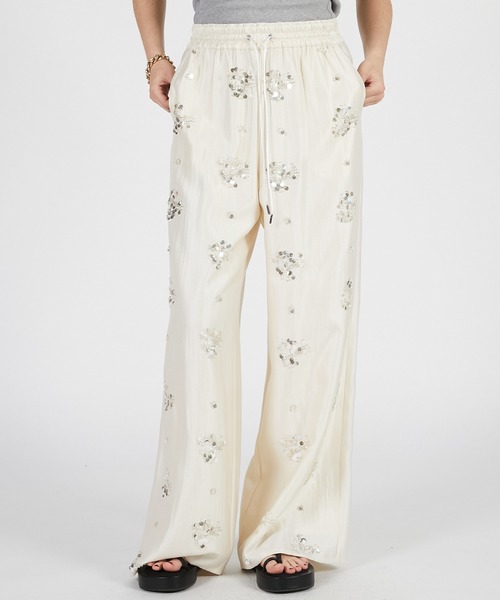 ーStyleー軽やかな落ち感のある素材に、植物柄モチーフの刺繍を散りばめた表情豊かなワイドパンツ。 ゆるく広がるレッグラインが縦の流れをつくり、軽さのある質感が動きと一緒に立体感を生み出す。 同色刺繍でまとめることで、過度な主張を抑えつつ、しっかりと存在感が残る絶妙なバランスに。 ウエストは穿きやすいゴム仕様で、ストレスフリーな着心地。 カジュアルになりがちな夏のスタイルに華やかさをプラス。 ーFabricー 控えめな光沢感のあるしなやかな合繊素材を使用し、植物柄の刺繍をビーズとスパンコールで施したデザイン。 ※注意事項※ 撮影用サンプルはNVYとWHTの刺繍柄が異なっております。 実際の商品は、NVYが正しいデザインとなりますので予めご了承ください。 【PRANKPROJECT/プランクプロジェクト】 常識に縛られない洗練された大人の女性に向けて ”意外性”と”品の良さ”をMIXさせた 上質なNEWMODEBRAND ・商品のお気に入り登録再入荷、残り1点などの通知を受け取ることが出来ます。 ・ブランドのお気に入り登録新商品や再入荷、ショップのおすすめトピックスなど、いち早くブランドのお得な情報を受け取ることができます。