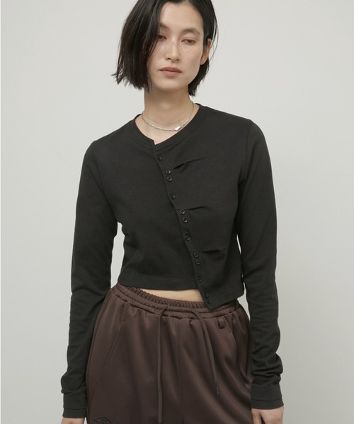 【design】 カシュクール風のアシンメトリーデザインを施したミニマルな印象のカットソー。 斜めにカットしたフロントとボタンディテールがアクセントになり、シンプルながらもモード感のある一枚に。 コンパクトなクロップド丈がウエストラインをすっきりと見せ、スタイルアップ効果も。 伸縮性のあるカットソー素材で、身体に程よくフィットしながら快適な着心地を実現。 一枚で着映えするデザインなので、ワイドパンツやデニムパンツなどのリラックス感のあるボトムスと合わせるだけで、 バランスの良いスタイリングが完成します。 ジャケットやアウターのインナーとしても活躍する長いシーズン着られるアイテムです。 【material】 綿75% 麻25% 透け感:なし 裏地:なし 伸縮性:あり 光沢感:なし 生地の厚さ:薄い ポケット:なし 【size】 着丈左46cm 右41cm 身巾40cm 肩巾34cm 袖丈71cm 【care】 洗濯可 【LA PEAU DE GEM】 -the ACTUALIZED- わたしは見えないものでできている。だから、装う。 「わたし」は職業や肩書き、年齢など一言で語られがち。 でも、いまのわたしをかたち作っているのはいつかの記憶、感動、失敗。触れたものの感覚や香りも。 わたしは見えないものでできている。だから、服、メイク、アクセサリー、ときに佇まいで、装うことで、表現する。 【お買い物をよりお楽しみいただくために】 ■商品のお気に入り登録(ハートマークをクリック) 完売カラーの再入荷通知や、在庫ラスト1点の通知、セールの通知を受け取ることができます。 ■ブランドのお気に入り登録 新商品がUPされたり売り切れ商品が再入荷したときなど、いち早くブランドのお得な情報を受け取ることができます。 是非ご利用頂き、お買い物をお楽しみください。 ※ご注文いただいた予約商品のお届け時期の確認は、注文履歴ページより行えます。 ※他のキャンペーンにより、期間中に価格が変動する場合があります。 ※セールは予告なく終了させていただく場合もあります。