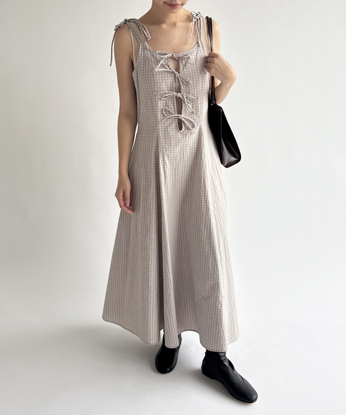 【Pre-Spring】 EDIT. FOR LULU 軽やかなコットンチェックのドレスです。 ワッシャー仕上げの先染めのチェックを使用しております。 カジュアルな素材感と大胆に開けたフロントのコントラストがポイントです。 たくさんの共地リボンがルルらしいキュートな一枚です。 肌馴染みのよい柔らかなグレー×ベージュとシックでモードなブルー×ブラックの二色展開です。 ※取り扱いについては、商品についている品質表示でご確認ください。 ※照明の関係により、実際よりも色味が違って見える場合があります。 またパソコン・スマートフォンなどの環境により、若干製品と画像のカラーが異なる場合もございます。 ※商品の色味は、商品アップ画像をご参照ください。 本体:手洗い可能