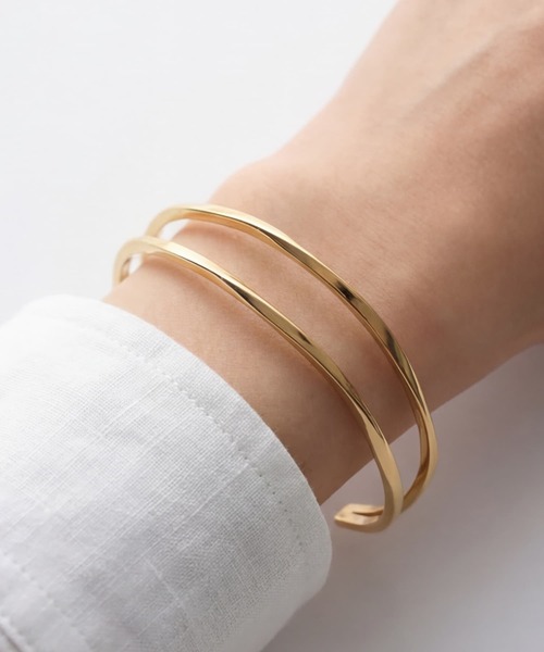 繊細なラインが手元にさりげない華やかさをプラスする、ツイストデザインのバングルブレスレット。 2本のラインが優美にクロスするシンプルなフォルムが、洗練された大人の手元を演出します。 素材にはステンレススチールを採用し、ゴールドメッキを施した上品なゴールドカラー。 変色しにくく、日常使いでも美しい輝きが長く続きます。 金属アレルギーの方にも配慮したステンレス素材なので、肌にやさしいのも嬉しいポイントです。 オープン型のバングルタイプで着脱もスムーズ。 手首にすっと馴染むしなやかなカーブで、つけ心地も軽やか。 単体で着けてもさまになり、他のブレスレットとの重ねづけにもぴったりです。 シンプルなデザインながら立体感のあるツイストラインが印象的で、デイリーからフォーマルまで幅広く活躍します。 【特徴】 ・316Lステンレススチール素材 ・変色しにくくお手入れ簡単 ・デイリー・フォーマル両対応 ・アレルギー配慮素材(※すべての方に反応が出ないわけではありません)