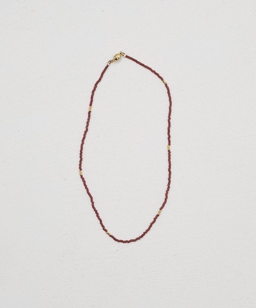 華奢なガラスビーズを連ね、あいだに配したゴールドビーズがアクセントを添えるチョーカー。ミニマルなデザインで、繊細なきらめきが首元にさりげないニュアンスをプラスしてくれるアイテムです。