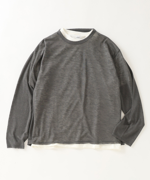 《インナーをセットにした、究極の「2-in-1」アイテム》 1. 絶妙なニュアンスを生む「シアー感」 表面には、独特なムラ感と上品な光沢を持つシアー天竺を採用。肌が透けすぎず、奥行きのある表情がクリーンな印象を際立たせます。 2. 完成されたレイヤードバランス 襟元、裾から覗くインナーの露出具合をミリ単位で調整。重ね着特有の着膨れ感を抑えつつ、一枚で着るだけでこなれた都会的なスタイルが完成します。 3. リラックスを格上げするシルエット 肩を落としたドロップショルダーと、適度なゆとりを持たせた身幅。リラックスした着心地ながら、素材のドレープ感によって「品の良い」佇まいをキープします。 【ご注意】 ※照明の関係により、実際よりも色味が違って見える場合があります。 またパソコン・スマートフォンなどの環境により、若干製品と画像のカラーが異なる場合もございます。 ※商品の色味は、商品アップ画像をご参照ください。 本体:手洗い可能