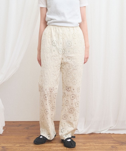 どこか懐かしい透かし模様の花柄。 ざっくりとした綿の雰囲気を生かした素材です。 パンツは1枚でも重ね着でも使いやすいサイズ感。 涼しく着ていただけます。両脇にポケットがあります。 ※アイボリーが正しいサイズ感です。 カラー展開:アイボリー、ブラック 【素材の特性、お取り扱いの注意】 ・この製品は、大変デリケートな素材を使用しておりますので、性質上、破損しやすく、糸引きやひきつれが起こりやすいので着用、着脱時、アクセサリー等には十分御注意下さい。 ・この製品は縫製後、製品洗いをしています。 そのため、多少の歪み、シワ等がみられ、1枚ごとに風合、サイズ等、微妙に違いますがこれはこの加工の特徴です。 製品洗いならではの雰囲気をお楽しみください。 ・この製品を洗濯する際には多少縮む場合がありますので、洗濯後形を整えてから日陰で干して下さい。 タンブラー乾燥はお避け下さい。塩素系漂白剤は御使用にならないで下さい。 ・濃色の場合、湿った状態での摩擦や長時間放置しますと他の物に色移りする事がありますのでご注意下さい。 ・着用の際はベルトやバック、周囲の壁など、表面の粗いものとの摩擦による引っかかりにもご注意下さい。 fig London(フィグロンドン) CONCEPT English vintage & country inspired natural look joy of slow life relax & cosy playful & curious イギリスのヴィンテージやカントリーを感じさせるナチュラルルック ちょっと間の抜けたゆったりライフの楽しみ リラックスできて着心地が良い 遊びごころがあり好奇心がわく イメージ、カタチ ※光の関係で実物の商品の色味とは若干異なる場合がございます。あらかじめご了承ください。 ※商品はサンプルです。実際の商品と仕様、加工、サイズが若干異なる場合がございます。 ※取り扱いの注意については取り扱い表示をよくご確認の上、着用をお願いいたします。