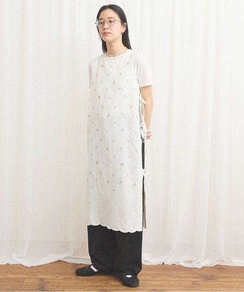 懐かしいカントリーな雰囲気の小花柄。くたっと感とほんのりツヤを感じるリネンレーヨンの素材に刺繍しました。 エプロンドレスはサイドを紐で結んでいるデザイン。 カラー展開:ホワイト、ブルー 【素材の特性、お取り扱いの注意】 ・この商品は麻素材を使用しておりますので特性としてシワになり易く織りきずが多少はいる場合があります。 又素材の色によりぬれたまま長時間放置しますと他の物に色が移染する場合がありますのでご注意下さい。 ・ひっかけや強い力が加わると、目寄れやキズが発生しますので、取り扱いにご注意下さい。 ・濃色品は、着用中の汗、摩擦等により、他の物に色移りすることがありますので、ご注意下さい。 着用やクリーニングの摩擦により、毛羽立ち、徐々に白っぽくなったり、毛羽の脱落により、光沢の変化が生じることがありますので、ご注意下さい。 雨、水濡れ、汗等が付着しますと、光沢が変わったり、シミとなる場合がありますので、その際はお早めにクリーニング店にお出し下さい。 ・この製品は縫製後、製品洗いをしています。そのため、多少の歪み、シワ等がみられ、1枚ごとに風合、サイズ等、微妙に違いますがこれはこの加工の特徴です。 製品洗いならではの雰囲気をお楽しみください。 ・この製品を洗濯する際には多少縮む場合がありますので、洗濯後、形を整えてから日陰で干して下さい。 タンブラー乾燥はお避け下さい。 塩素系漂白剤はご使用にならないでください。色が変わることがあります。 この製品は、刺繍をほどこしておりますので、刺繍部分を乱暴に扱いますと破損しやすく、強い摩擦や洗濯には充分注意して下さい。 ・ひっかかり、ひきつれが起り易いので、着用、着脱時には、十分注意して下さい。 fig London(フィグロンドン) CONCEPT English vintage & country inspired natural look joy of slow life relax & cosy playful & curious イギリスのヴィンテージやカントリーを感じさせるナチュラルルック ちょっと間の抜けたゆったりライフの楽しみ リラックスできて着心地が良い 遊びごころがあり好奇心がわく イメージ、カタチ ※光の関係で実物の商品の色味とは若干異なる場合がございます。あらかじめご了承ください。 ※商品はサンプルです。実際の商品と仕様、加工、サイズが若干異なる場合がございます。 ※取り扱いの注意については取り扱い表示をよくご確認の上、着用をお願いいたします。