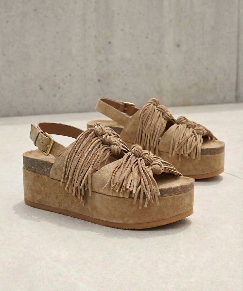 【ASH公式ショップ】 2026年 Spring&Summer COLLECTION 存在感のあるフリンジ厚底サンダル。 歩くたびにボリュームたっぷりのフリンジが揺れ、コーデの主役として活躍します。 また、温かみのあるスエード素材を使用し、結び目のデザインを加えることで、クラフト感漂うモードなボヘミアンスタイルに。 ボリューミーな厚底はつま先からかかとまで高低差が少ないフラットな形状となっており、安定感のある履き心地のため、ヒールが得意でない方でも挑戦していただきやすいのも◎ バックストラップはご自身の足に合わせてサイズ調節していただけるベルト仕様のため、厚底でも足にフィットして履いていただけます。 マキシ丈のワンピースや、クロシェ編みのアイテムと合わせて、こなれ感のあるリゾートスタイルや、シンプルなTシャツ×デニムスタイルに合わせて足元が主役のコーデなど様々なスタイルにおすすめです。 ■ソール、つま先、かかと部分にはヴィンテージ加工が施されております。 ■天然皮革の為、色むらや軽微な傷等が残っていることがあります。