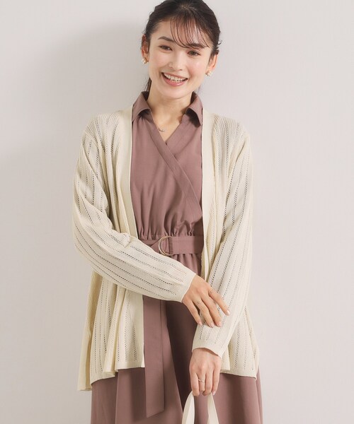 【デザイン】 透かし編み柄が涼し気な着流しカーディガン。 ミディアム丈で腰周りもさり気なくカバー。 ツヤ感のあるレーヨン・ナイロンの糸を使用した上品な透かし編みニットカーディガン。 繊細で小柄な透かし編み柄が着やすく、きれいめからカジュアルまで幅広いコーディネートにマッチ。 さらりと羽織れる着流しタイプのデザインで、落ち感のある素材が美しいドレープを作ります。 サイドスリットが抜け感をつくり、パンツでもスカートでも合わせやすいデザインになっています。 【素材】 さらりとした肌触りとツヤ感が特徴の糸を使用したニット。 ※照明の関係により、実際よりも色味が違って見える場合があります。また、パソコン・スマートフォンなどの環境により、若干製品と画像のカラーが異なる場合もございます。 ---------------------------------------- ★お気に入り登録がおすすめ★ ▽気になる商品はハートマークをクリック! ・再入荷やセールの通知をお知らせ ・お気に入り一覧からいつでもチェック ▽ブランドのお気に入り登録も! ・新商品やお得な情報をいち早くお知らせ ---------------------------------------- モデル情報:身長164cm B80 W60 H84 着用サイズ:00(フリーサイズ) 店舗へのお問い合わせ商品番号:P93-35007 ●製品寸法: 00(フリーサイズ):着丈60cm B106cm 袖丈57cm 肩幅38cm 備考: