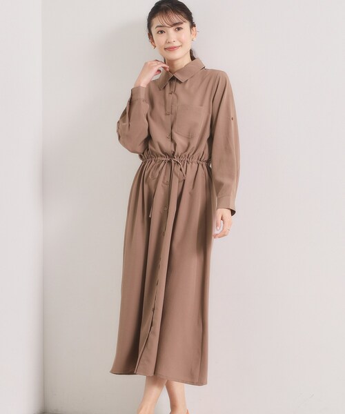 【デザイン】 ロールアップで袖丈の調整可能。 さらりとした肌触りの嬉しい機能付き素材です。 1.UVケア 2.イージーケア 3.吸水速乾 4.接触冷感 一枚着のワンピースとしてはもちろん、前開きで羽織としても使えるデザイン。 ウエストの紐を絞ればシルエットにメリハリが生まれます。 シャツ襟デザインはきちんと感を演出でき、オフィスシーンにもおすすめ。 袖はロールアップデザインで調節可能なのでロングシーズンお使いいただけます。 【素材】 さらりとしたパウダリーなタッチ感の薄手素材。 【仕様】 ・ポケット数:横×2 胸元×1 ・裏地なし ※こちらの商品はやや透け感があるため、インナーの着用をおすすめします。 ※この製品は、吸水速乾効果のある素材を使用しています。この効果は永久的ではありません。 ※この製品は、太陽光線中の紫外線(UV)を通しにくくします。この効果は永久的ではありません。 ※照明の関係により、実際よりも色味が違って見える場合があります。また、パソコン・スマートフォンなどの環境により、若干製品と画像のカラーが異なる場合もございます。 ---------------------------------------- ★お気に入り登録がおすすめ★ ▽気になる商品はハートマークをクリック! ・再入荷やセールの通知をお知らせ ・お気に入り一覧からいつでもチェック ▽ブランドのお気に入り登録も! ・新商品やお得な情報をいち早くお知らせ ---------------------------------------- モデル情報:身長164cm B80 W60 H84 着用サイズ:00(フリーサイズ) 店舗へのお問い合わせ商品番号:P93-55010 ●製品寸法: 00(フリーサイズ):着丈120cm B98cm 袖丈57cm 肩幅36cm W~98cm H114cm 備考: