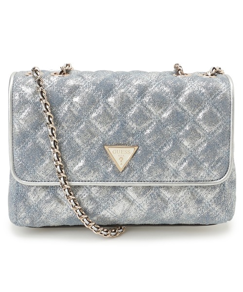 煌めくメタリック素材と端正なキルティングデザインが目を引くショルダーバッグ。 淡いブルーの輝きに、ゴールドのチェーンストラップと金具が上品なアクセントを添えます。 フラップ裏や縁取りには、滑らかな質感のレザー調素材を使用し、高級感のある仕上がりが魅力です。 バッグを開けると、GUESSロゴがプリントされた裏地が広がり、ファスナーポケットを含む複数の内ポケットで小物もスマートに収納可能。 チェーンの長さを変えれば、ショルダーとしてもハンドバッグとしても楽しめる2WAY仕様も嬉しいポイントです。 デイリーカジュアルにはもちろん、イベントなどの特別な日にも、あなたのスタイルをワンランクアップさせる洗練されたアイテムです。