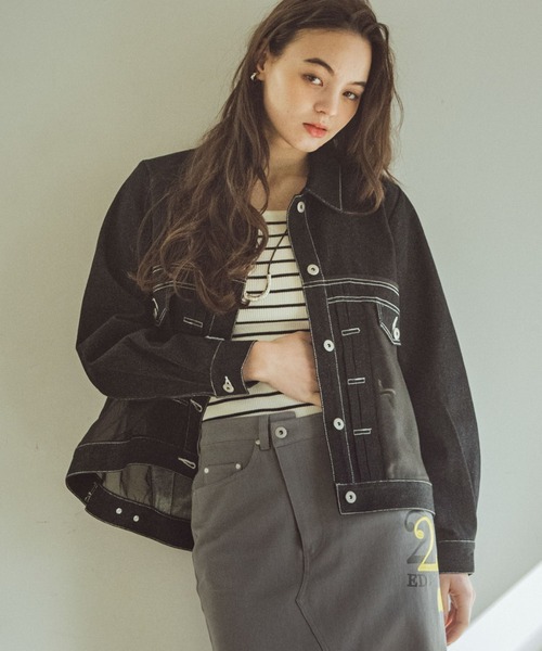 デニム×メッシュのコンビネーションジャケット 胸の高い位置から切り替え、フレアを程良く入れたシルエットはさり気無く気になる体型もカバーアップ。 トレンドのシアー感を取り入れたメッシュ使いがポイントです。 フロントのシャーリングが立体感を生み、シンプルなトップスを合わせるだけでも着映えするデザイン。 Iラインを強調するナローシルエットで、スッキリとした印象に。 タックデティールやフレアを取り入れたシルエットが羽織るだけでこなれた印象に。 -------------------------------------- 透け感:メッシュ部分のみあり 裏地:なし 伸縮性:なし ケア方法:手洗い可 ※お洗濯の際は洗濯表示を必ずご確認ください。 --------------------------------------