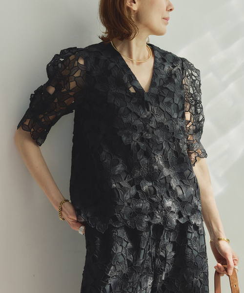 【2026SS】 VERMEIL par iena 羽織としても活躍する軽やかモードブラウス。 立体的な表情が美しい、オリジナルのカットワークレースで仕立てたブラウス。 涼やかなサックスブルーと、大人のムードを引き立てるブラックの2色展開です。 ほどよい光沢感がカジュアルさを抑え、タウンユースにも映える上品な印象に。 前を閉じてブラウスとしてはもちろん、羽織りとしても使える軽いジャケット感覚の一枚。 抜け感のある半袖シルエットが、レースの立体感と相まってモードな雰囲気をつくります。 同素材のパンツとのセットアップで華やかにまとめたり、デニムでカジュアルダウンしてもバランスよく決まり、シンプルなボトムに合わせるだけでスタイルが完成。 1枚で“軽さ”と“存在感”を両立できる、大人のためのカットワークブラウスです。 ※シリーズもございます。 Cutwork Lace イージーパンツ(品番 26030938332020) ********************** 透け感:ややあり 裏地:あり 伸縮性:なし 光沢感:ややあり 生地の厚さ:普通 ********************** 【お取り扱い等について】 ・取り扱いについては、商品についている品質表示でご確認ください。 ・照明の関係により、実際よりも色味が違って見える場合があります。 またパソコン・スマートフォンなどの環境により、若干製品と画像のカラーが異なる場合もございます。 ・商品の色味は、商品アップ画像をご参照ください。 ・こちらの商品は、VERMEIL par iena での取り扱いになります。 直接店舗へお問い合わせの際は VERMEIL par iena店舗へお願い致します。 ブラック着用スタッフ身長:162cm 着用サイズ:フリー サックスブルー着用スタッフ身長:159cm 着用サイズ:フリー 詳細着用スタッフ身長:163cm 着用サイズ:フリー セットアップ詳細着用スタッフ身長:162cm 着用サイズ:フリー 本体:手洗い可能