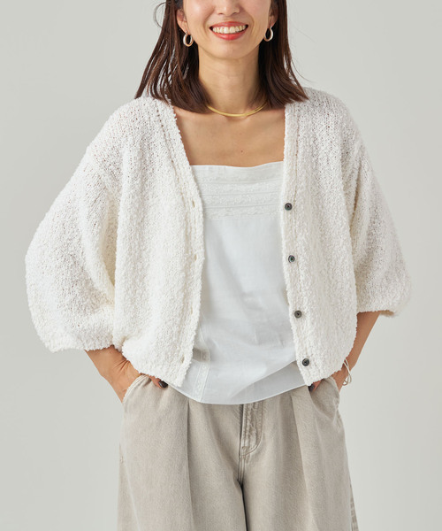 【2026SS】 VERMEIL par iena 質感で魅せる。エアリーに纏うショートカーディガン. ドライなタッチながら、表面に凹凸のある編地がニュアンスを生むショートカーディガン。 空気を含んだような軽いボリュームスリーブと、腰位置で止まるコンパクトな丈感が、羽織るだけでスタイリングの重心をすっきり整えてくれます。 ニット特有の甘さを抑えたドライな風合いは、シアー素材や微光沢ボトムなどつやっと、さらっとした素材と合わせるとよりモードに。 デニムに合わせてカジュアルダウンしてもバランス良く決まる、汎用性の高いデザインです。 手洗い可能の扱いやすさも魅力で、季節の変わり目の軽い羽織としてデイリーに活躍。 さらっと重ねるだけで、スタイルにニュアンスが宿る一枚です。 ********************** 透け感:ややあり 裏地:なし 伸縮性:ややあり 光沢感:なし 生地の厚さ:普通 ********************** 【お取り扱い等について】 ・取り扱いについては、商品についている品質表示でご確認ください。 ・照明の関係により、実際よりも色味が違って見える場合があります。 またパソコン・スマートフォンなどの環境により、若干製品と画像のカラーが異なる場合もございます。 ・商品の色味は、商品アップ画像をご参照ください。 ・こちらの商品は、VERMEIL par iena での取り扱いになります。 直接店舗へお問い合わせの際は VERMEIL par iena店舗へお願い致します。 ホワイト着用スタッフ身長:159cm 着用サイズ:フリー ブラウン D着用スタッフ身長:162cm 着用サイズ:フリー 詳細着用スタッフ身長:162cm 着用サイズ:フリー 本体:手洗い可能