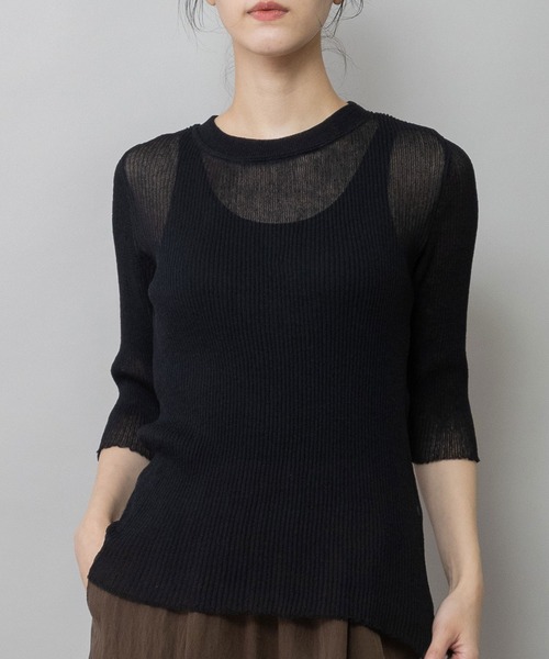 □ Munich 2026 spring & summer collection □ ◆大人っぽい袖丈も魅力!程よいシアー感とニットならではの伸縮性を兼ね備えた着心地抜群なシアーリブトップス◆ <MATERIAL> 麻とポリエステルを組み合わせた細番手の素材。 ポリエステルを高混率にする事により、麻のナチュラルで柔らかな質感に、ドライで清涼感のあるタッチと、程良い張り感を加え、トレンド感ある質感に仕上げたのが特徴。 編地は3x3のリブ編み。細番手の軽さを生かし、1本取りで編み立てたシアーな編地ですが、程良い柔らかさと空気を含んだ様な膨らみがあり、他にはない編地に仕上がっています。 使いやすいベーシックカラーとマルチボーダーの展開で、カットソーのシアーアイテムには表現できないオリジナリティーある編地に仕上がっているのが特徴です。 <DESIGN> カットソーにはない繊細な編地でこなしたシアーリブトップスです。 春夏に最適なドライでカサツキのある素材感のシアーリブ。 薄手の素材感ながらも、立体的なリブ編みが空気を含むことでふんわりとした肉感になり、繊細な質感とふくらみを持った独特な表情に仕上がっています。 春から夏にかけて活躍できるハーフスリーブは、大人が着られる丈感にこだわり、編地の立体感が身体のラインを拾いすぎず、タイトなシルエットなのに太って見えず、身体を美しく見せてくれます。 使い勝手の良いアイテムなので、無地はもちろん。レトロな雰囲気に仕上げたトレンド感あるマルチボーダーが特におすすめ <COLOR> ■アイボリー:ふんわりと光を含んだミルクのように柔らかいアイボリー ■ブラック:モードにもカジュアルにも振れる、涼しげなシアーブラック ■グレー:曇り空がふわりと広がるような、柔らかくニュートラルなトーンのミディアムグレー ■ネイビー系:深いネイビーに、グリーン・イエロー・ブラウンなどのラインが走る華やかなボーダー ■アイボリ系:柔らかなアイボリーに、ブルーやレッドのラインが映える、軽やかなレトロ可愛い配色 ※光のあたり具合いやパソコンなどのモニター環境によって実際の色味と異なって見える場合がございますので、予めご了承ください。 ※着用商品はサンプルです。サイズ等の仕様に若干の変更がある場合がございますので、予めご了承ください。 ※お取扱いについては、商品についております品質表示、アテンションタグにてご確認ください。 洗濯:手洗い可 .............................≪INFORMATION ≫............................ ▼商品のお気に入り登録▼ 『♡』マークを押してお気に入り登録して頂いた商品は、セール開催の通知やクーポン発行などのキャンペーンなど、お得な情報をいち早く受けとる事が出来ますので、ぜひご登録ください。