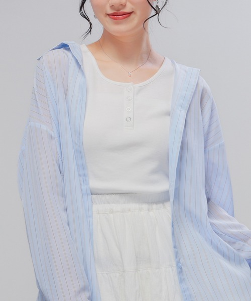 シンプルなのにお洒落見え 【デザイン】 シンプルながら胸元のボタンがアクセントになるヘンリーネックデザイン。 短め丈のすっきりシルエットと縦目のラインで、細見え効果も◎ 【素材・機能】 ストレッチの利いた綿混テレコ素材で、フィット感がありながらストレスフリーな着心地。 紫外線対策ができる『UVカット』機能付き。 【スタイル】 シアーシャツやニットカーデなど、透け感のあるアイテムと合わせれば今年らしいスタイルに♪ ボタンを開けてインナーの重ね着を楽しむのも◎ 品番:654-13-9845