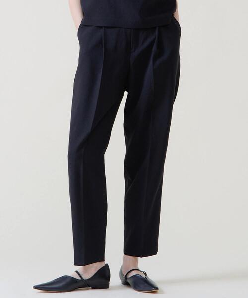 【デザイン/コーディネート提案コメント】 横に広がらずに腰周りにゆとりを持たせたパンツは ハイウエストでスタイルアップするシルエット。 深いタックがセンタープレスに続きすっきり見えします。 ウエスト後ろ部分ゴム仕様。同素材のトップス(A0161FB421) とセットアップ可。 【素材コメント】 麻のようなドライなタッチが特徴の素材。 色の濃淡と表情感があるような無地でも雰囲気が出るのが特徴。 ■透け感 なし ■伸縮性 なし ■光沢感 なし ■裏地 なし ■生地の厚さ 普通