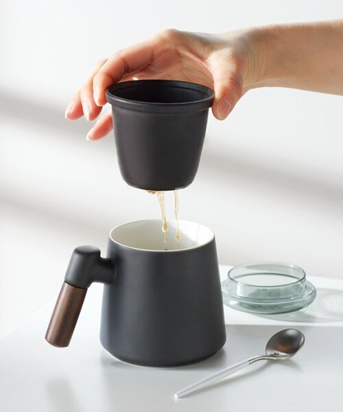 木目の美しい取っ手に、マットな質感の陶器が重厚感を感じさせるマグカップ 急須やティーポットがなくても、これ一つで本格的なティータイムが楽しめるティーストレーナーカップです。 カップ、ティーストレーナー(茶こし)、蓋がセットになっており、誰でも簡単においしいお茶を淹れることができます。 使い方はストレーナーに茶葉を入れ、カップにセットしてお湯を注ぐだけ。 付属の蓋を使えば、茶葉がゆっくりと蒸らされ、豊かな香りと深い味わいを最大限に引き出します。 スモーキーな色合いの耐熱ガラス製の蓋の組み合わせが、見た目のスタイリッシュさと洗練さを引き立たせてくれます。 機能性も見た目も抜群なアイテムです。 〈サイズ〉 マグカップ:直径7.9cm×高さ9cm 蓋:直径8cm×高さ2.7cm 茶こし:直径8.2cm×高さ6.9cm ボックス:15.5cm×10cm×高さ11.7cm 〈内容量〉440ml レンジ、食洗機ともに使用不可