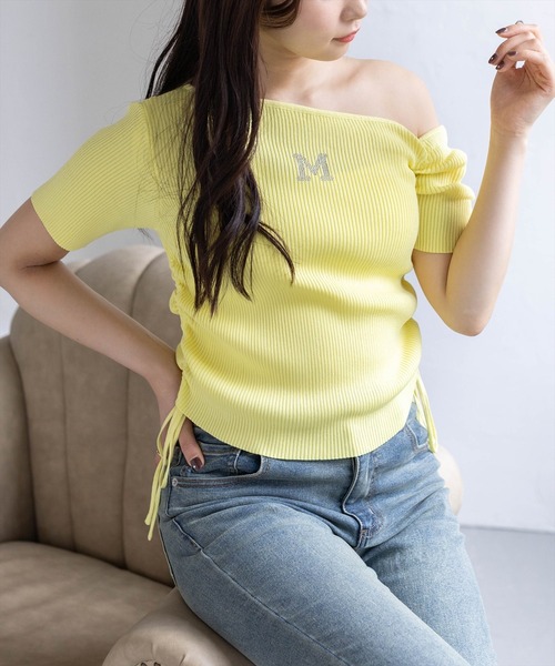 【2026SS】 clear さりげない肌見せに輝きをひとさじ!ラインストーンロゴドロストワンショルニットトップス 【デザイン】 トレンド感たっぷりのワンショルデザインにきらっと輝くラインストーンロゴが目を惹くニットトップス。 アシンメトリーなネックラインが、さりげない肌見せで女性らしさを演出します◎ 両サイドのドロストデザインは、絞り具合で丈感やシルエットの調節が可能です! 【素材感】 伸縮性のあるレーヨン素材 伸縮性:若干あり/ 透け感:オフホワイトのみ若干あり/ 裏地:なし 水洗いによる洗濯不可 / ドライクリーニング可 【コーディネート】 ワイドデニムやカーゴパンツと合わせてストリートコーデに♪ プリーツミニスカートやフレアミニスカートと合わせてガーリーコーデにも! ダメージパンツとも相性抜群◎ 【※お取り扱い上のご注意】 1:モニター環境等により実際の商品と多少色味が異なって表示される場合がございます。予めご了承下さい。 2:屋外で撮影された商品は、天候により多少実際のカラーと異なる場合があります。商品のカラーはトルソー(マネキン)の商品画像をご参照ください。 3:濃い色の商品は、お洗濯や摩擦等による移染にご注意ください。 4:末永くご愛用頂く為に、アテンションタグ・洗濯ネームを必ずご確認の上、着用又はお取り扱い下さい。 5:生産時期により、色、サイズ、デザイン、素材の質感が多少が異なる場合がございます。あらかじめ御了承下さいませ。