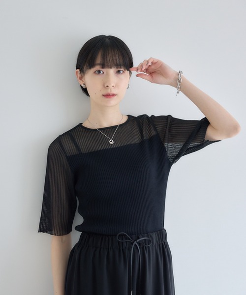 シアーな透け感と端正なリブが織りなす奥行きのあるニットトップス <POINT> ヨークから袖にかけて配したシアーリブが、装いに洗練された抜け感を演出。 コンパクトなシルエットとショート丈のバランスが、今の気分に寄り添うこなれたスタイルを叶えます。 【デザイン・シルエット】 肩周りから袖にかけての透け感を主役にした、表情豊かな切り替えデザイン。 身頃は透けを抑えたリブニットで仕立てることで、一枚で安心して着用できる機能性とデザイン性を両立しました。 スッキリとした半袖とコンパクトな着丈が、ボリュームのあるボトムスとも相性良くまとまり、スタイルアップを後押しします。 【素材感】 レーヨン混のシャリ感があるドライな質感が、肌に心地よく馴染みます。 細やかなリブ編みによる豊かな伸縮性が身体のラインを優しく整え、きれいなフォルムをキープ。 ヨーク部分の繊細なシアー感と、身頃のしっかりとした質感のコントラストが、コーディネートにリズムをもたらします。 【カラー】 ホワイト ブラック ブルー 3色展開 【スタイリング】 印象的なシアーデザインを活かして、ハイウエストのワイドパンツやナロースカートと合わせるのがおすすめ。 デニムでカジュアルダウンしても品良くまとまる、大人のための主役級ニットです。 裏地:なし 光沢:なし 伸縮性:あり 透け感:一部あり 生地の厚さ:薄手 ポケット:なし 【cloche】 ”可愛くお洒落に”に応える、よりリアルな大人可愛いアイテムを提案します。 ※照明の都合上、多少の色ブレが生じてしまう可能性がございますので、予めご了承くださいますようお願い致します。 --------------------------------------------------- ●お気に入り登録でお得情報を手に入れよう! 「商品のお気に入り登録」をすると、再入荷通知や、ラスト1点の通知、セールの通知など、お得情報が届きます。 また、マイページでいつでも確認が可能になります。 「ブランドのお気に入り登録」をすると、新商品や再入荷、などいち早くブランドの最新情報をお届けします。 ぜひ、ご利用ください。 ----------------------------------------------------