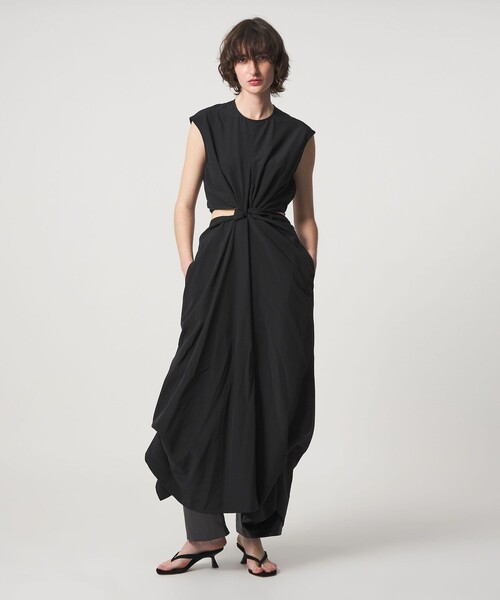 80年~90年代のジャパニーズモードをオマージュしたような、ノスタルジーモダンを現代の感性でデザインしたワンピース。 上下セパレートみえするデザインは、ウエスト位置よりも高めのポイントですっきりとみせ、さりげない肌みせで大人のヘルシーな印象に。 ナチュラル感のある表面と清涼感を併せ持つナイロンセルロースブレンドの生地を使用し、攻めすぎず気負いなく纏えるモードスタイルを演出します。 遊び心の仕掛けとして、マキシ丈のスカート部分に付属したゴムリングを足に装着する事でユニークなフォルムの変化を生み出します。 ゴムの留める位置での変化は様々で、バルーンのようなフォルムをお楽しみいただけます。 ゴムリングは着脱可能。 一枚着で、ノスタルジーな大人モダンスタイルに導きます。 ============================ 裏地:なし 透け感:なし 伸縮:なし 光沢感:ややあり ============================ 【注意事項】 ※商品に「取り扱い上の注意書き」、「洗濯表示」がございます場合は、使用前に必ずご確認ください。 ※商品画像は、光の当たり具合やパソコンなどの閲覧環境により、実際の色味と異なって見える場合がございます。あらかじめご了承ください。 ※商品の色味の目安は、商品単体の画像をご参照ください。 店舗へお問い合わせの際は、全国の6(ROKU)各店舗まで下記の品名/品番をお申し付けください。 品名:6 NY/CEL OP 品番:86262000010