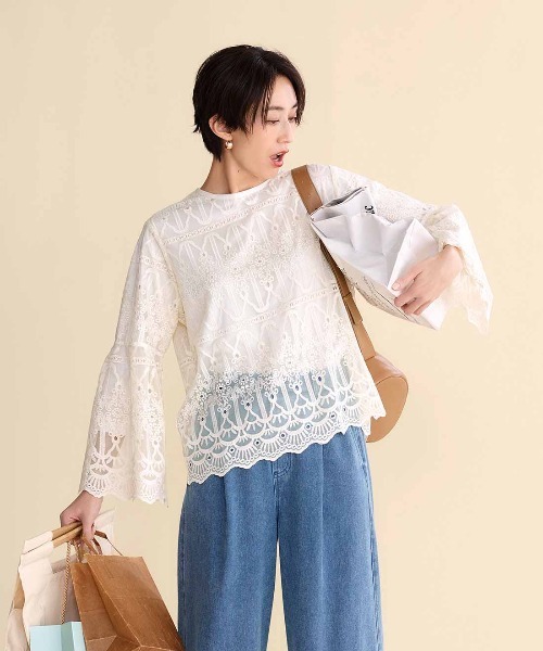 インナーに悩まず旅先で気分も上がるレースブラウス 落ち感のあるやわらかなチュールに大人っぽい柄ゆきの刺しゅうで贅沢感たっぷり! 袖口やすそのスカラップが美しさを一層引き立てる総レースのブラウスは、身ごろとひじ下までカットソーの裏地付きで肌寒い時期やインナーの悩み対策にも安心です。 タックでふんわりさせた袖で華やぎを盛りつつ、手首がのぞく九分袖で、華奢見えも計算しました。 ※フェリシモの商品には、紐などでくくられている紙タグは付属しておりません。