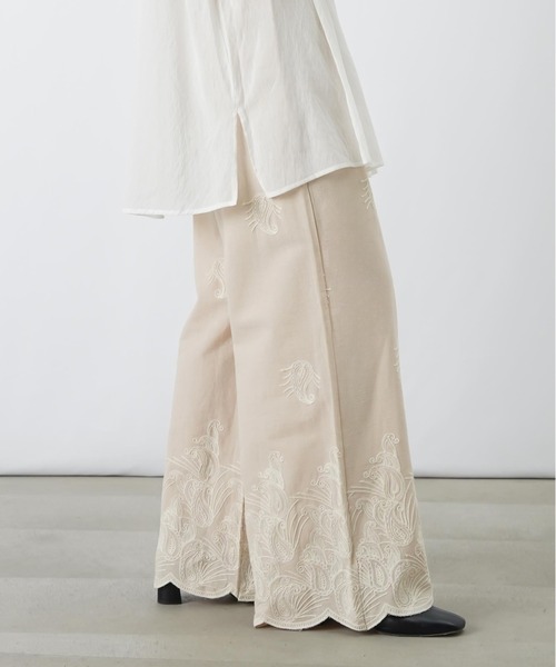 2026 Spring & Summer 【ほどよい刺繍デザインが目を引く刺繍コットンパンツ】 ◆Design 繊細な刺繍を全体に施した、存在感のあるワイドパンツ。 特に裾にかけてたっぷりとあしらわれた刺繍が目を引き、 コロニアルなエスニックムード漂う一着です。 ゆったりとしたワイドシルエットで、リラックス感がありながらも華やかな印象に。 シンプルなトップスと合わせるだけで、スタイリングがぐっと引き立ちます。 アイボリーにはペチパンツ付きで、透け感を気にせず安心して着用していただけるのも嬉しいポイントです。 ◆Fabric ・やわらかくナチュラルな風合いのコットン素材。 ◆color ・アイボリー、ブラックの2色展開です。 ◆Styling ・ワンピースをレイヤードしたラフなスタイルに。 ・Tシャツにベストやビスチェを合わせた大人カジュアルなスタイルに。 ・シアーブラウスを合わせた女性らしいスタイルもオススメです◎ -------------------------------- 生地の厚さ:薄手 透け感:アイボリーのみややあり 伸縮性:なし 光沢感:なし 裏地:アイボリーのみあり 洗濯:手洗い可 -------------------------------- 【お買い物をよりお楽しみいただくために】 〇商品のお気に入り登録 完売カラーの再入荷や、完売間近の通知、セールの通知を受けることができます。 〇ブランドのお気に入り登録 新商品や再入荷など、いち早くブランドのお得な情報を受け取ることができます。 【♡をクリック!ご登録お願いします!】