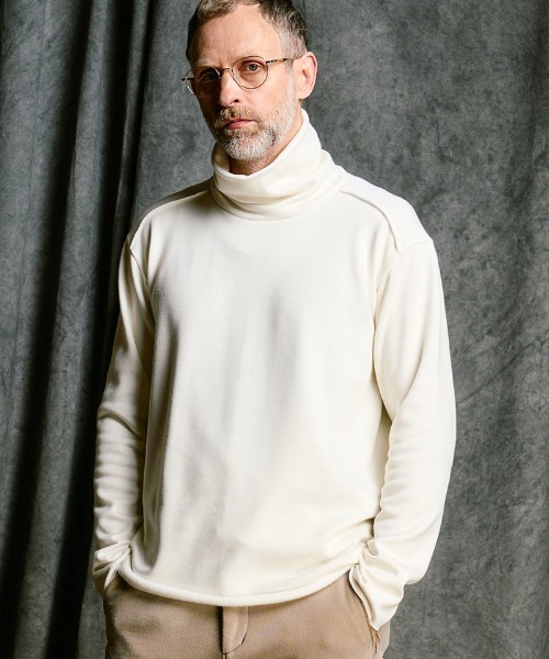 断ち切りディテールを活かした、ハイネック仕様のプルオーバー。 ミニマルな構成の中に、wjkらしい無骨さとアルチザンな空気感を落とし込んだ一着です。 <デザイン・シルエット> 素材本来の柔らかな風合いを最大限に引き出すため、シームラインを極力抑えた設計を採用。 ストレスのない着用感と洗練された佇まいを両立させています。 背面には配色のハシゴステッチを走らせ、さりげないアクセントとともにアルチザンな雰囲気を演出しています。 ネックは過度に主張しすぎない、絶妙な高さに設定。 程よいボリュームを持たせることで、単体での着用はもちろん、コートやレザージャケットのインナーとしてもバランス良く収まります。 首元に自然な立体感を生み、冬のスタイリングに奥行きを与えます。 <素材> 吸湿発熱性と高い保温性を備えた高機能素材「ソフトサーモ(R)」を使用した裏起毛素材を使用。 身体から発せられる湿気や汗を吸収して熱へと変換し、衣服内の暖かさを効率的にキープします。 さらに、カシミアのように滑らかで柔らかな肌触りと優れたストレッチ性を兼備。 裏起毛ならではの包み込まれるような着心地でありながら、蒸れにくく快適な着用環境を実現しています。 冬のインナーとしての機能性と、wjkらしいデザイン性を融合。 ミニマルでありながら確かな存在感を放つ、完成度の高いウィンターアイテムです。 モデル着用サイズ:Lサイズ ・LOOKモデル H:185cm B:95cm W:76cm ・スタジオモデル(髭あり) H:185cm B:95cm W:75cm ・スタジオモデル(髭無し) H:187cm B:90cm W:75cm