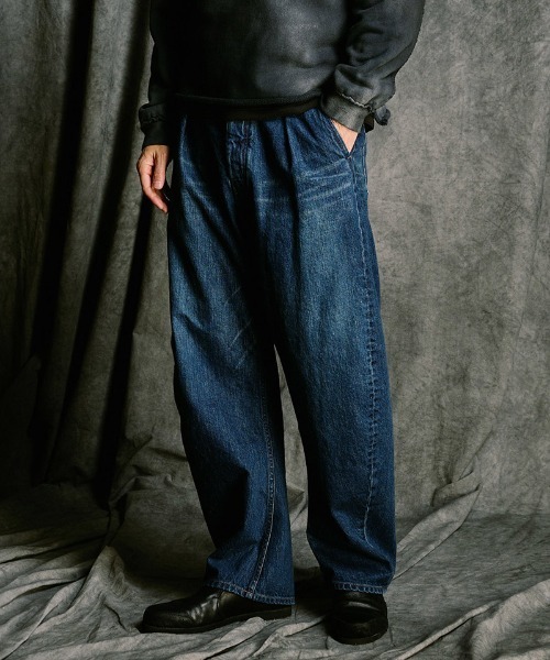 wjkの象徴である-バナナシルエット-をワイドバランスで再構築した、存在感のあるデニム。 立体裁断の構築美と、ヴィンテージ加工による奥行きある表情を融合させた一本です。 <デザイン・シルエット>ベースは深めのワンタックを配したスラックス仕様。 フロントは端正に、バックスタイルはデニムのディテールで構成することで、異なる要素を巧みにミックスしています。 膝から裾にかけてのライン設計とサイドシームを緻密に調整し、wjk独自の-バナナシルエット-をワイドアレンジで構築。 立体的なボリュームを持ちながら、生地の落ち感によって自然なドレープが生まれ、落ち着きのある佇まいに仕上げています。 ウエストは両脇のみゴム仕様とし、外観のスマートさを保ちながら快適なフィット感を確保。 フロントはクラシックな釦フライ仕様です。 <素材>・col.56/indigoused70年代ヴィンテージデニムをサンプリングした12ozネップデニムを採用。 ネップを打ち込むことで、独特のムラ感と立体的な色落ちを実現。 着込むほどに豊かな経年変化を楽しめる素材です。 ・col.98/d.charcoalタテ糸にトップ糸、ヨコ糸にチャコールの硫化染め糸を使用した12ozデニム。 タテ7番手、ヨコ12番手で織り上げ、重厚な質感とヴィンテージライクな色落ちを表現しています。 トップ糸ならではの奥行きある色味が特徴です。 両素材とも、デニムの聖地岡山にて製作。 世界屈指の加工技術を有する岡山県井原市にて仕上げ加工を実施。 職人が一点一点手作業でシェービングを施し、ウォッシュ加工を重ねることで、穿き込んだような自然なアタリと立体感を表現しています。 個体ごとに異なる表情も魅力です。 構築的なワイドシルエットと岡山の高度な加工技術が融合。 無骨さと品格を兼ね備えた、完成度の高いワイドバナナデニムです。 ※2092 dn91とセットアップ着用可能 モデル着用サイズ:Lサイズ ・LOOKモデル H:185cm B:95cm W:76cm ・スタジオモデル(髭あり) H:185cm B:95cm W:75cm ・スタジオモデル(髭無し) H:187cm B:90cm W:75cm
