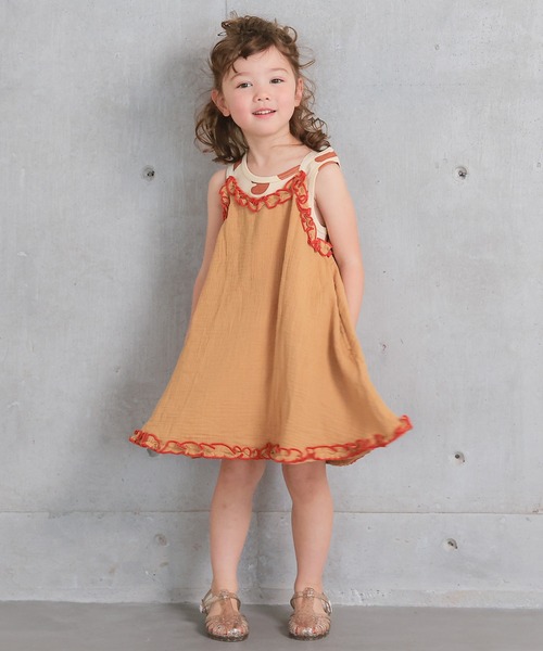 ふわりと揺れて ときめきをまとう主役キャミワンピース♪ ■デザイン やわらかなダブルガーゼ素材を使用した、軽やかな着心地のキャミワンピースです。 ふんわり広がるAラインシルエットが、動くたびにやさしく揺れて華やかな印象を演出します。 肩まわりと裾にあしらった配色フリルがアクセントになり、シンプルながらも存在感のあるデザインに仕上げています。 華奢な肩ひもデザインが抜け感をプラスし、女の子らしい雰囲気を引き立ててくれます。 ■スタイリング インナーにTシャツやタンクトップを合わせて、レイヤードスタイルを楽しめる1枚です。 レギンスやフレアパンツを合わせれば、より印象的でおしゃれな着こなしに仕上がります。 1枚でさらりと着るのはもちろん、柄アイテムや配色インナーと合わせた遊び心のあるスタイリングもおすすめです。 デイリーからお出かけまで、シーズンムードたっぷりに活躍します。 ■関連商品(同シリーズ) Wガーゼシャーリングホルターネックトップス/0041161005 Wガーゼキャミワンピース/0040961018 Wガーゼシャーリングショートパンツ/0040161001 Wガーゼシャーリングフレアパンツ/0040161002 ■生地感 やわらかく空気を含んだようなダブルガーゼ素材で、やさしい肌あたりが魅力です。 通気性が良く、汗ばむ季節でもさらっと快適に着用できます。 軽やかでナチュラルな風合いがあり、暑い時期にも心地よく着られる1枚です。 ++++++++++++++++++++++++ 透け感:少しあり 伸縮:なし 厚み:普通 ++++++++++++++++++++++++ ※ネームタグ付き ※ポケットあり(サイド) ※モデルが着用している画像は、照明や日光などの撮影時の環境により実物と異なる色味になる場合がございます。 商品単体の平置き画像を実物に近いお色味になるよう努めておりますので、お色味のご確認は平置き画像をご参照くださいませ。 ※お使いのモニター環境によっても実物のお色味と異なって見える場合がございます。予めご理解の程よろしくお願いいたします。 ハートマークをポチッ! 気になる商品はお気に入り登録をお忘れなく! 商品のお気に入り登録をすると... [再入荷][残り1点][セール情報]を受け取れます。 MARKEY'Sをお気に入り登録すると... [新商品][再入荷]の情報をいち早く受け取れます。