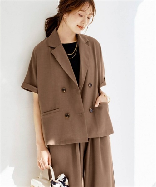 ◆今、クローゼットにプラスしたい最旬ジャケット◆ 「ただシンプルできれいなだけじゃ物足りない」そんな大人の遊び心をくすぐる、半袖ダブルテーラードジャケットが登場しました。 カッチリしすぎないゆったりとしたシルエットが、頑張りすぎない大人の余裕を演出。 羽織るだけで品格をキープしつつ、周囲と“ちょっと”差がつくスタイリッシュな佇まいへと導きます。 日常を鮮やかに彩り、あなた自身の輝きを引き出す特別な一着です。 ■デザイン 洗練された印象を与えるダブル仕様のデザインながら、 身幅にゆとりを持たせたラフなシルエットが最大の特徴です。 袖口はロールアップデザインを採用しており、 気になる二の腕周りを視覚的にすっきりと見せてくれる体型カバー効果も。 さらに、肩回りが動かしやすいラグランスリーブを取り入れることで、 インナーに半袖を合わせてももたつきにくく、スマートな着こなしをキープします。 裏地のない一枚仕立てで仕上げており、ジャケットとしてのきちんと感がありながら、 シャツのように軽やかに羽織れる新鮮なリアルクローズです。 後ろにはベンツ(スリット)が入っているため、 バックスタイルも美しく、動きやすさも兼ね備えています。 ■素材 表面感の美しい麻調合繊生地を使用しています。 ポリエステルの特性を活かした、シワになりにくく お手入れが簡単な耐久性の高い素材でありながら、程よい張り感と上品な光沢感が大人の品性を感じさせます。 ポリウレタンを配合することでストレッチ性も持たせており、 長時間の着用でもストレスフリーな着心地を実現しました。 夏場まで涼しく快適に過ごせるよう、軽さと通気性を追求した一枚仕立てにこだわり、手洗いも可能。 お気に入りの一着を長く、大切に愛用したいという願いに寄り添う、上質な素材感が魅力です。 ■おすすめのスタイリング ブランドが提案する、大人カジュアルの王道スタイルを楽しんで。 インナーにはシンプルなカットソーを合わせ、 デコルテにゴールド系のネックレスを重ね付けすることで、スタイリッシュな華やかさをプラス。 ボトムスにはボリューム感のあるワイドパンツを合わせると、 上下のバランスが整い、こなれたオシャレ上級者の雰囲気が漂います <仕様> ポリエステル95%・ポリウレタン5% ポケット前2 前ボタン開 裏地:無 後ベンツ有 <洗濯方法> 手洗い ■キーワード おしゃれ、お出かけ、きれいめカジュアル、きれカジ、アウター、オフィス、オフィスカジュアル、シンプル、ジャケット、デート服、トレンド、初夏、夏、大人女子、愛され、着回し