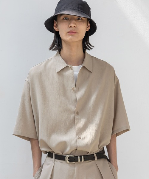 【デザイン・特徴】 ゆったりとしたシルエットで、サッと羽織るだけでリラックスした雰囲気が出るシャツです。 首元が開いたデザインなので、顔まわりがすっきり見えて爽やかな印象に。 カラーは、着回しやすい「グレージュ」「ブラック」と、着こなしのアクセントになる「テラコッタ」「カーキ」の4色展開。 いつもの服にプラスするだけで、ちょっといい感じにまとまります。 【素材】 サラッとした軽い生地感で、暑い時期でも快適に着られます。 ほんの少しストレッチが入っているので、動いたときの窮屈感もありません。(ポリエステル98%・ポリウレタン2%) さらに、シワになりにくく洗濯後も乾きやすいのが嬉しいポイント。 アイロンの手間も省けるので、気兼ねなく日常使いできます。 【スタイリング】 いつもの無地Tシャツに重ねるだけで、シンプルでかっこいいスタイルが作れます。 セットアップでの着こなしも今っぽくておすすめです。 少し太めのパンツやサンダルと合わせて、ラフに着るのがよく似合う一枚です。 ▼同素材のパンツはこちらブランド品番:648306 ZOZO商品コード:106291646