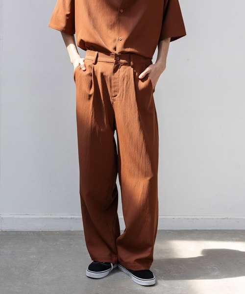 【デザイン・特徴】 ゆったりとした太めのシルエットで、リラックスして穿けるワイドパンツです。脚のラインを拾わないため、体型カバーにも役立ちます。 ウエストの前面には折り目(タック)が入っており、腰回りにゆとりを持たせつつも、ダボつかずにスッキリとした立体的な見た目を作ってくれます。トップスをインしても様になる、シンプルで洗練されたデザインです。 【素材】 すとんと下に落ちるような、なめらかで柔らかい生地を使用しています。 この生地の「落ち感」があるおかげで、太めのパンツでも野暮ったく見えず、大人の上品さを演出してくれます。動くたびにきれいな揺れ感が生まれ、さらっとした快適な穿き心地も魅力です。 【スタイリング】 いつものシンプルなTシャツに合わせるだけで、グッと今っぽいこなれた雰囲気のコーディネートが完成します。 ゆったりとしたシャツを羽織ったり、同系色のトップスと合わせてまとまりのある着こなしにするのもおすすめです。 足元はスニーカーでカジュアルに決めるのはもちろん、夏はサンダルで抜け感をプラスしたり、レザーシューズで少しカチッと引き締めたりと、どんな靴とも相性が良く幅広いスタイルを楽しめます。着回しやすい落ち着いたカラー展開で、毎日の服選びが楽しくなる一本です。 ▼同素材のシャツはこちらブランド品番:648304 ZOZO商品コード:106291610