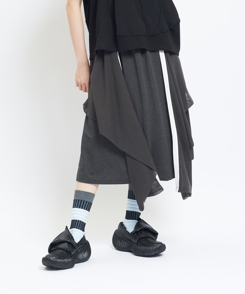 2026 SPRING&SUMMER COLLECTION ■design ・後ろから前にかけてチュールを重ねた、流れるようなレイヤードデザインが印象的なスカート。 ・フロントには縦ラインを効かせることで、デザイン性がありながらもすっきりとした印象に仕上げました。 ・異素材で切り替え、前後で変化をつけたシルエットが奥行きのあるバランスをつくります。 ・ウエストは総ゴムでリラクシーに着用可能。 ・存在感のあるディテールを持ちながら、日常のスタイリングにも取り入れやすい一枚。 ■fabric ・接触冷感のある夏にピッタリのポンチ素材。 ・ストレッチ性に優れているためシワや毛玉ができにくく、型崩れの少ないテキスタイル。 ■coordinate ・デザイン性のあるスカートなので、トップスはコンパクトなカットソーがおすすめ。・動きのあるデザインカットソーを合わせるとモードなスタイリングに。 ‥‥‥‥‥‥‥‥‥‥‥‥‥‥‥‥ 厚さ:厚手 透け感:なし 伸縮性:あり 光沢感:なし ポケット:なし 裏地:なし ※詳しいお手入れ方法は商品タグをご参照ください。 ‥‥‥‥‥‥‥‥‥‥‥‥‥‥‥‥ 《お知らせ》 ・商品画像はご覧のモニター環境により、実物の色味と多少異なる場合がございます。予めご了承ください。 ・「商品のお気に入り登録」で再入荷・値下げ・在庫1点などの通知を受け取ることができます。 ・「ブランドのお気に入り登録」で新商品や再入荷など、お得な情報を受け取ることができます。 ※他のキャンペーンにより、期間中に価格が変動する場合があります。 ※セールは予告なく終了させて頂く場合もあります。