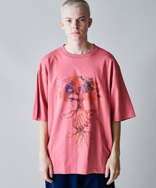 【 生地 】6.6ozのしっかりした生地厚で、透け感が気にならない度詰の天竺です。 つや感のある上品な風合いで肌触りの良さが特徴的な素材です。 -------------------------------------------------- 裏地:なし 透け感:なし 生地の伸び:ナチュラルストレッチのみ 光沢感:なし ケア方法:洗濯機洗い可 -------------------------------------------------- 【 デザイン・シルエット 】 中心に、手と樹木が一体化したような印象的なモチーフを配置したグラフィックTシャツです。枝葉には鮮やかなカラーを散りばめ、水彩のような滲みや飛沫表現を取り入れることで、有機的でアート性の高い仕上がりになっています。 プリントはインクジェット方式を採用し、繊細な色のグラデーションや細かなディテールまで忠実に再現しています。 生地は6.6ozの度詰天竺を使用し、透けにくく、上品なつや感と柔らかな肌触りが特徴です。 ゆとりのあるボックスシルエットで、一枚で着てもサマになるデザイン。 デニムやミリタリーパンツなどと合わせたカジュアルな着こなしに最適です。