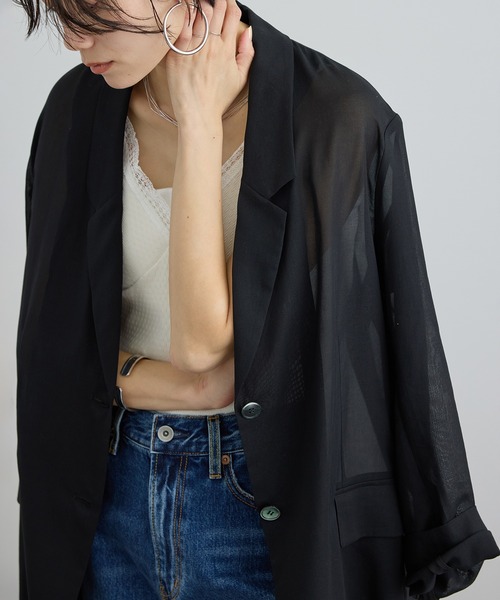 軽やかなシアー素材のコットンジャケット。冷房対策にも活躍する大人の軽羽織り ■デザイン/シルエット シャツ感覚でリラクシーに着られるコットン100%のシアージャケット。 通気性に優れ、なめらかな肌触りで暑い季節も快適に着用できます。 程よくゆとりのある身幅と袖に、シャープなラペルを組み合わせることで大人の抜け感を演出。 袖をたくし上げたラフな着こなしもおすすめです。 タンクトップやTシャツにさっと羽織るだけでスタイリングが決まり、冷房対策や日よけとしても活躍。 ロングシーズン着回せる一着です。 ■素材 高品質なテキスタイル開発を行う「山崎テキスタイル」の素材を使用。 100/2の細番手の糸をツイル組織で織り上げたコットン100%のボイル素材で、 なめらかな表面感とさらりとしたタッチが特徴。 天然素材ならではのやさしい肌あたりで快適な着心地を実現します。 ■コーディネート タンクトップやTシャツにさらりと羽織るだけで抜け感のあるスタイリングに。 デニムやワイドパンツと合わせたカジュアルスタイルから、ワンピースの羽織りとしても活躍。 冷房対策や季節の変わり目にも便利な軽羽織りです。 ■コットンボイルシアーシリーズ一覧 ・商品番号:SHV36230 商品名:コットンボイルシアージャケット ・商品番号:SHE36230 商品名:コットンボイルシアーキャミワンピース ■モデル身長:166cm 着用サイズ:F ----------------------------- 裏地:なし 光沢感:あり 透け感:あり ポケット:あり 伸縮性:なし 生地の厚さ:薄手 -----------------------------